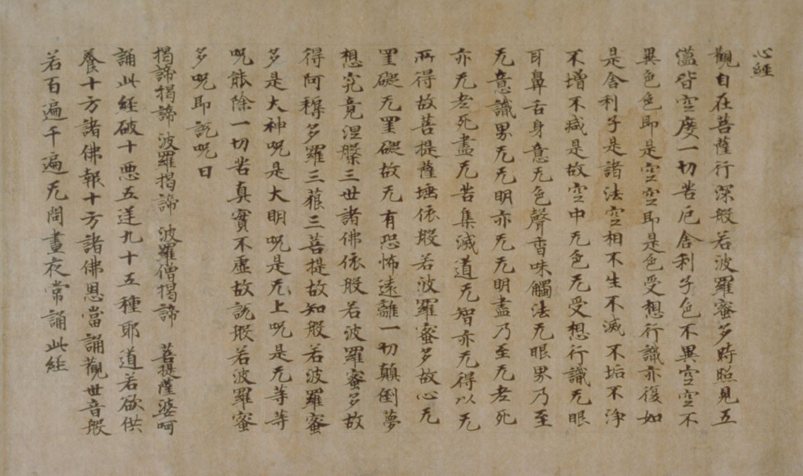 Esta versión del Sutra del Corazón en caligrafía china fue escrito en Japón hace casi 1300 años. El manuscrito se conoce como el Sutra del Corazón Sumidera y según la tradición fue escrito por Kobodaishi Kukai, el famoso fundador del la escuela Singon. Sin embargo el documento es más antiguo que Kukai que vivió desde 774 hasta 835!