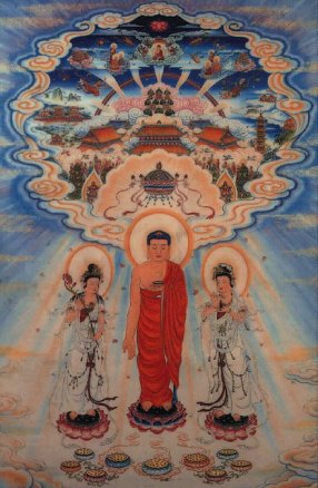 Aún estaba hablando cuando el Buddha de la Vida Infinita apareció en medio del cielo, y a su izquierda y a su derecha los dos grandes sabios que le asisten, Avalokitesvara y Mahâsthâmaprâpta. Su luz era tan fulgurante que resultaba imposible de mirar: brillaba con el incomparable color de oro de cien mil ríos Jambû.